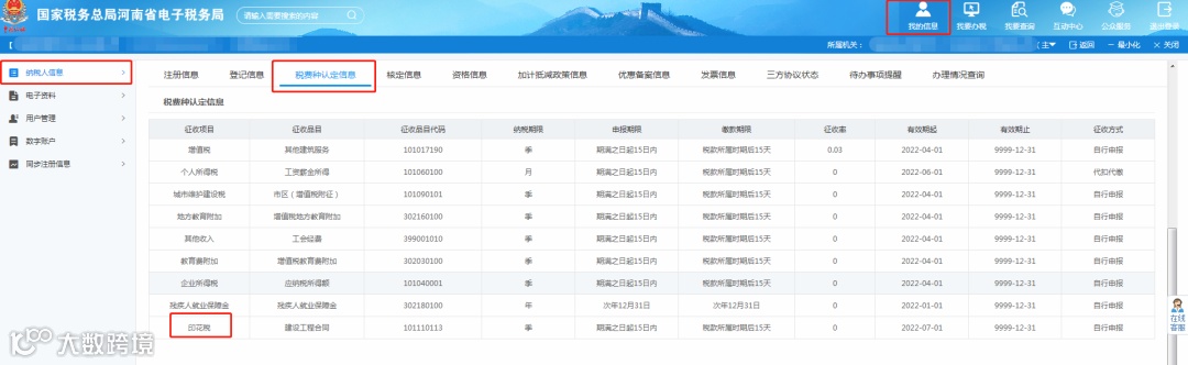 以国家税务总局河南省电子税务局为例,大家可以登录进电子税务局(路径为:我的信息-税费种认定信息)自行查看税费种认定信息(如下图二所示),确认每个税种的纳税申报期限,千万不能遗漏忘记申报哦~
