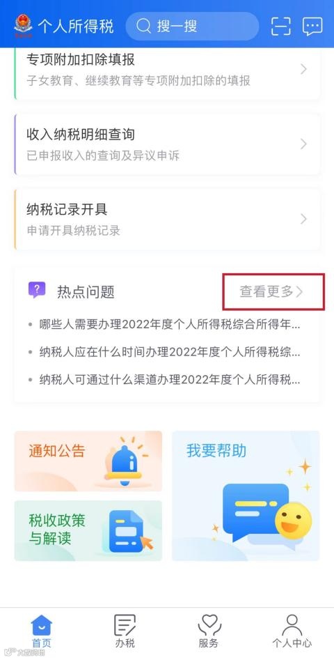 个人所得税App首页下拉到“热点问题”栏目,点击“查看更多”,进入国家税务总局12366纳税服务平台,可查看热门问答、搜索相关税收政策。