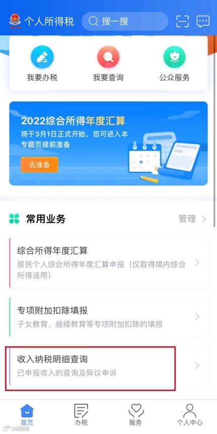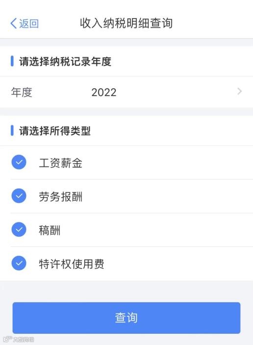 通过个人所得税App首页“常用业务”中的“收入纳税明细查询”,选择纳税记录年度及所得类型,可以查询对应年度扣缴义务人在预扣预缴环节申报的纳税人工资薪金、劳务报酬、稿酬和特许权使用费综合所得的收入情况。