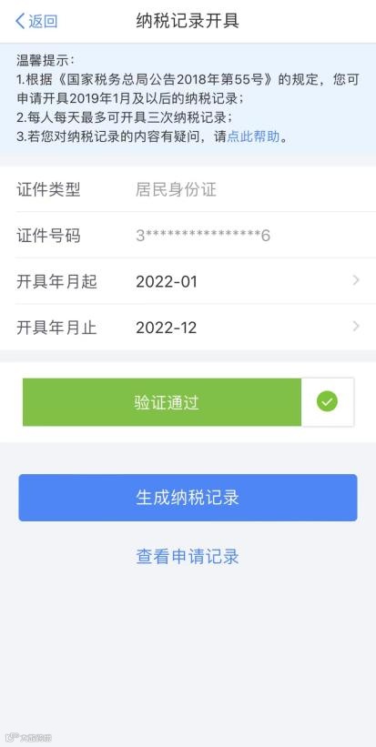 点击个人所得税App首页“纳税记录开具”,在进行身份验证后,选择开具年月起、止,生成纳税记录进行查询。也可以通过“我要办税”-“纳税记录开具”进行操作。