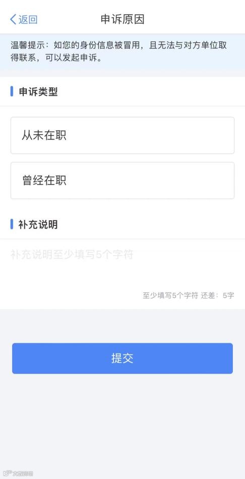 根据是否为曾经任职的单位,申诉类型选择“曾经在职”或“从未在职”,在“补充说明”栏次填写具体情况后提交,由税务机关展开调查。