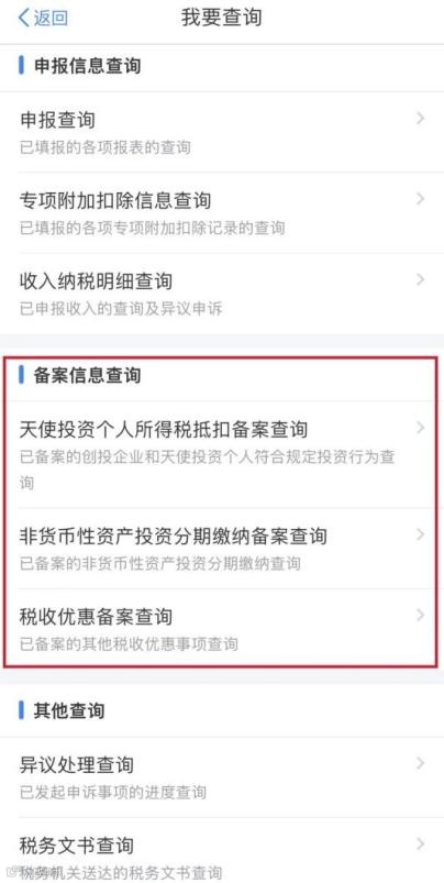 通过个人所得税App首页“我要查询”-“备案信息查询”,可以查询三项税收优惠备案查询项目: