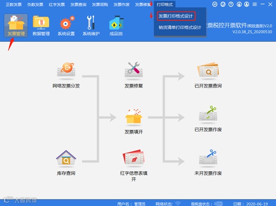 点击【打印】后,出现打印预览界面,点击【设置】,进行打印发票调整。或者通过【发票管理】-【打印格式】-【打印格式设置】,出现打印预览界面,点击【设置】。