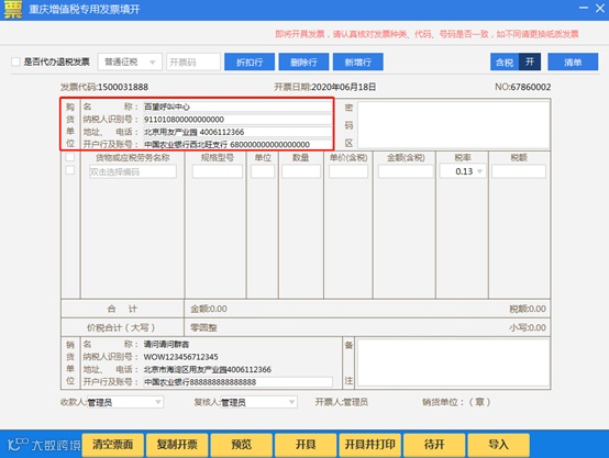 1.增值税专用发票,购方4项信息都不能为空,名称项最大长度为100个字符,但考虑到打印空间有限,最好不要超过66个字符。