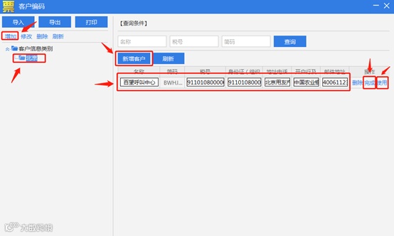 双击【名称】输入框,便弹出【客户编码】窗口,选取一个客户,然后【双击】,则本条客户信息便写入发票界面对应的编辑框。也可以直接在发票填开界面输入名称、纳税人识别号、地址、电话、开户行及电话。