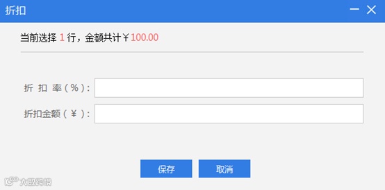 利用第一种填开商品信息的方法开具若干行商品后,首先选中欲加折扣的某个商品行或多行商品行的最后一行,然后点击商品信息右侧的【批量折扣】按钮,便弹出【折扣】对话框。