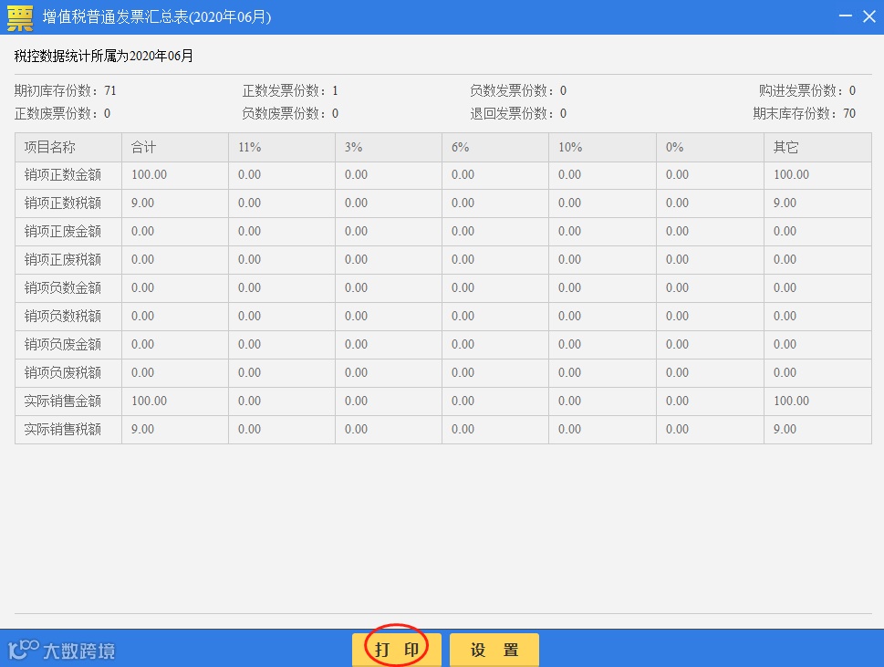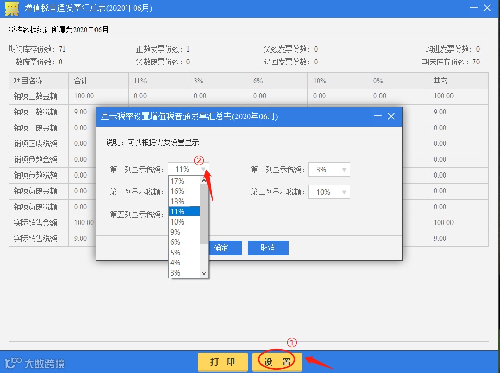 用户也可对该种类发票的汇总表进行打印和设置显示的税率。点击【设置】按钮。
