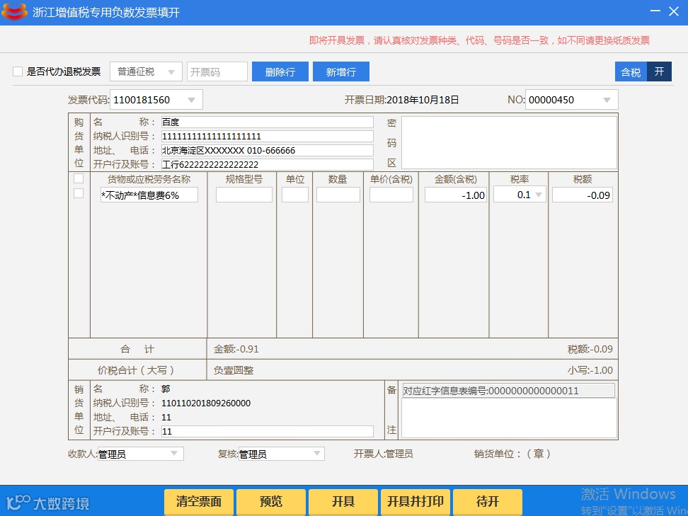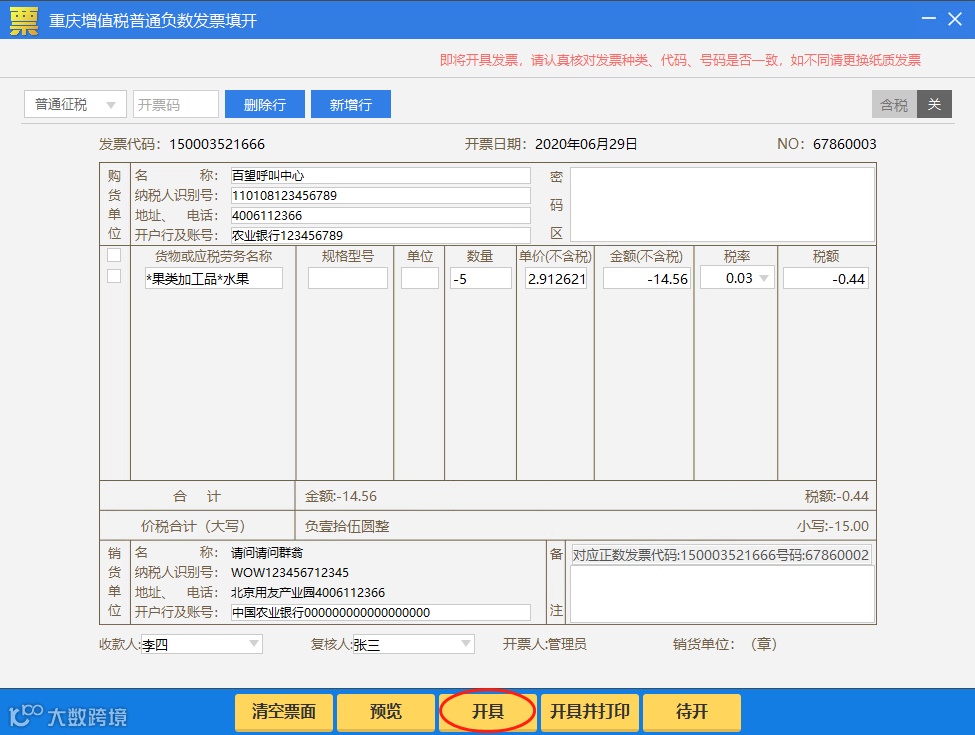 确认发票填开界面上的所有信息正确后,点击【开具】或【开具并打印】按钮,负数发票开具成功。