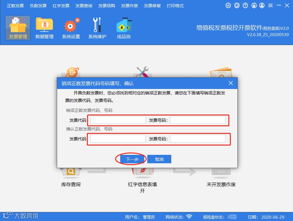 在此窗口中直接填写负数发票所对应正数发票的【发票代码】、【发票号码】,两次输入完全相同时,点击【下一步】按钮进入填开界面。