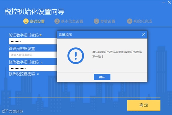 若输入的新证书密码与确认证书密码不一致,系统会提示确认输入证书与数字证书密码不一致。