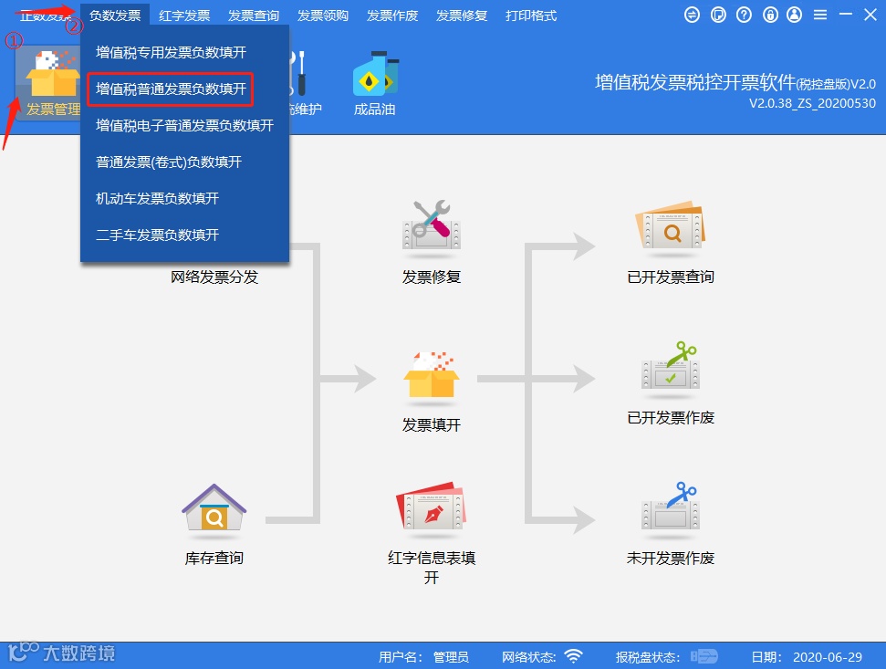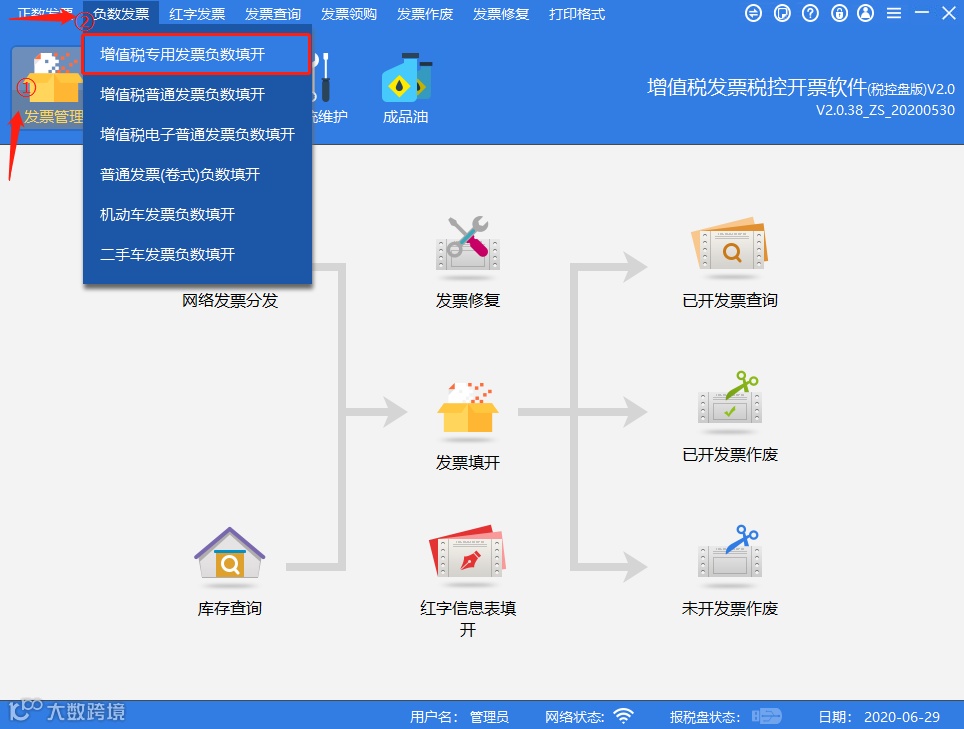 点击【发票管理】-【负数发票】-【增值税普通发票负数填开】菜单项。