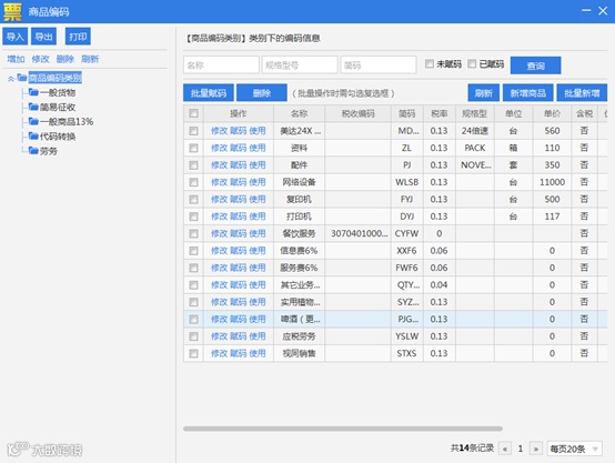 ①双击商品信息的【双击选择编码】输入框,便弹出【商品编码】窗口,可从中选取一种商品,然后双击之,则本条商品的名称、规格型号、单位、单价和税率等信息便写入发票界面的商品信息行。