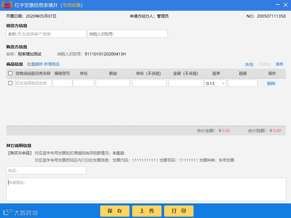 由销售方申请开具红字信息表时,根据实际情况选择理由后,选择发票种类,并填写对应蓝字发票代码和号码,点【确定】按钮后,如果数据库中有对应蓝字发票,进入信息表填开界面。