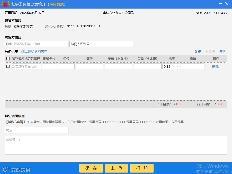 纳税人识别号 :自动取自税控盘中记录的本企业税号,不可更改,税号可以为15位-20位数字和字母。