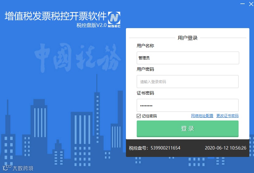 3、提示输入税控盘密码和税务证书密码