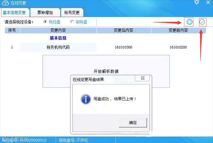 提示“写盘成功,结果已上传!”,点击【确定】,变更成功。