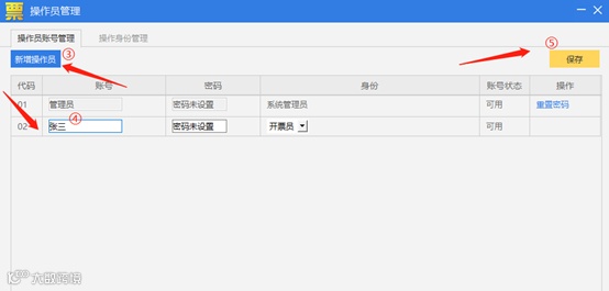 2、在操作员账号管理列表框内,新增开票员,点击【新增操作员】,输入【开票员姓名】,选择身份为【开票员】点击【保存】,新增开票员成功。使用新增的操作员姓名登录软件即可。