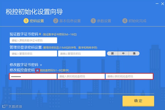 安装系统后,点击桌面生成的快捷方式图标, 正确输入税控设备的密码(初始密码为8个8)后,进入“密码设置”界面。
