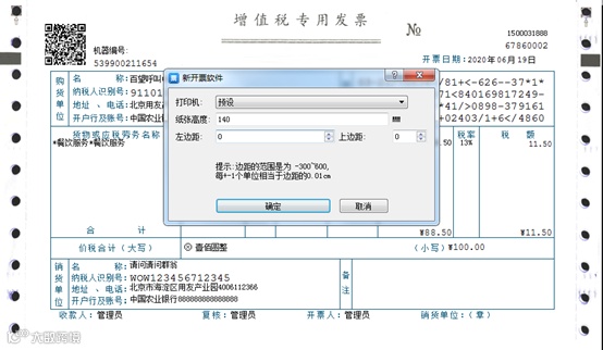 说明:需把预设打印机,修改为当前型号的打印机,发票调整规则为:往上偏,增大上边距,反之则减小上边距值,左右一样的方式。偏1cm调整100个单位。打印到与发票一样大小的白纸上测试即可。