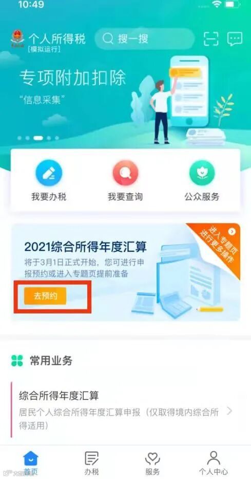 打开个税APP,若您还未预约,可通过“首页-2021综合所得年度汇算专题区域”点击“去预约”进入预约功能页面,也可以通过“我要办税/办税-综合所得年度汇算申报预约”进入预约功能页面,如下所示: