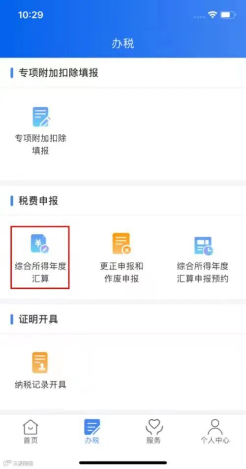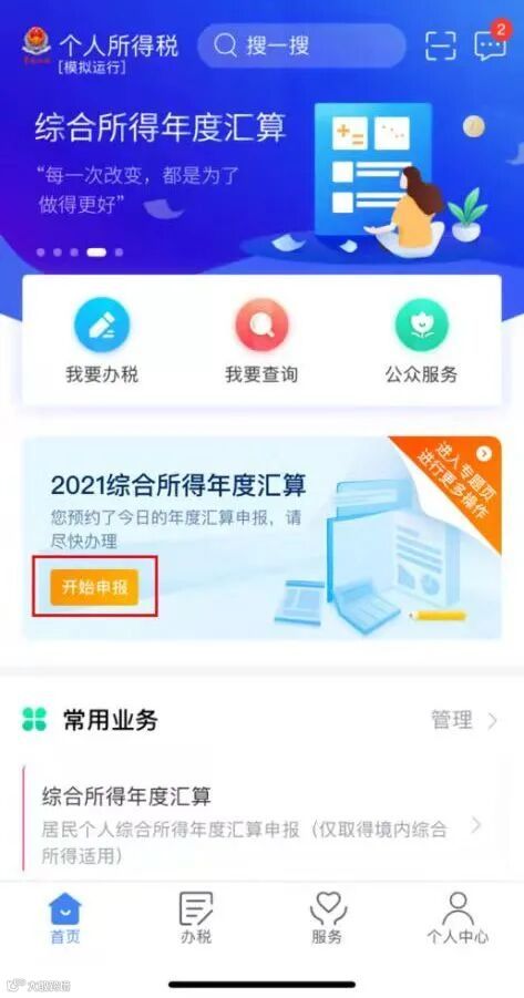 打开个税APP,您可通过“首页-2021综合所得年度汇算专题区域”点击“开始申报”,或通过“我要办税/办税-综合所得年度汇算”发起申报,如下图所示: