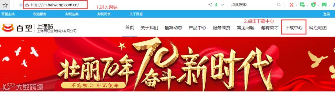4、进入百望网www.sh.baiwang.com.cn点击右上方的【下载中心】。