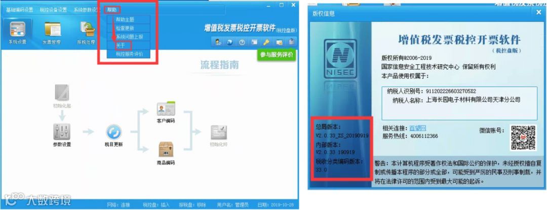 9、进入开票软件后,点击【帮助】-【关于】界面,在左下角显示软件版本。