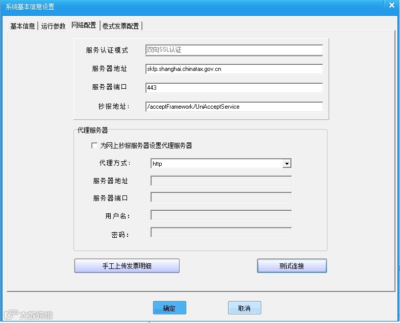 点击开票软件【系统设置】-【参数设置】-【网络配置】,查看服务器地址和端口号,服务器地址:skfp.shanghai.chinatax.gov.cn 端口号:443 如果正常,需要联系税局查询企业基本信息在防伪税控系统是否异常。