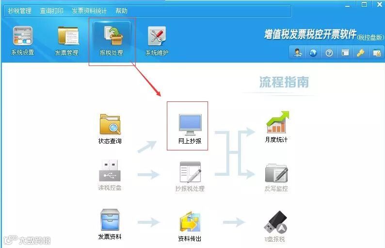 1.确保电脑是正常联网状态,登录开票软件。点击“报税处理/网上抄报”。