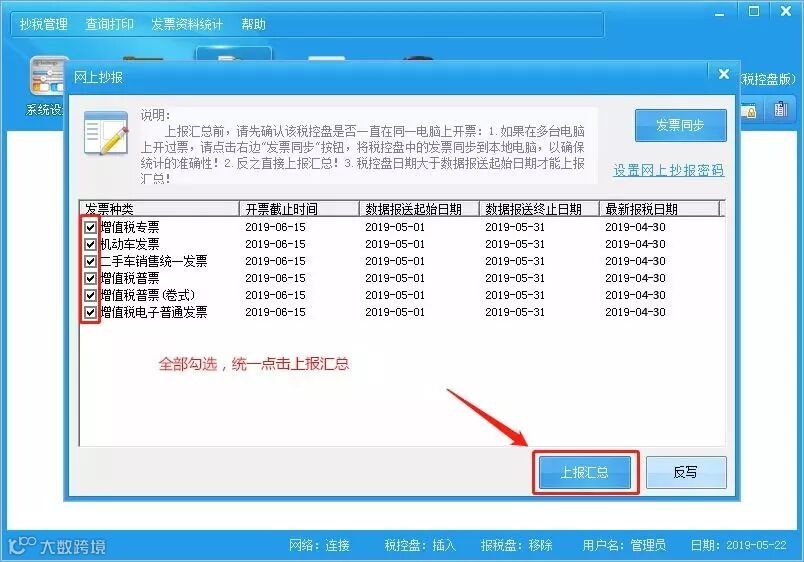 温馨提醒:只要在税控盘中存在的发票类型(主分机结构的也同样适用,所有的税控盘当中的所有票种),都必须在征期的时候勾选【上报汇总】,然后【反写】。