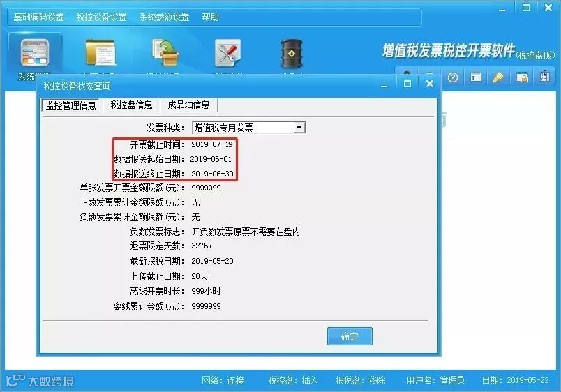 打开【报税处理】-【状态查询】-【监控管理信息】,确认开票截止日期是否更新至2019年7月19日左右。