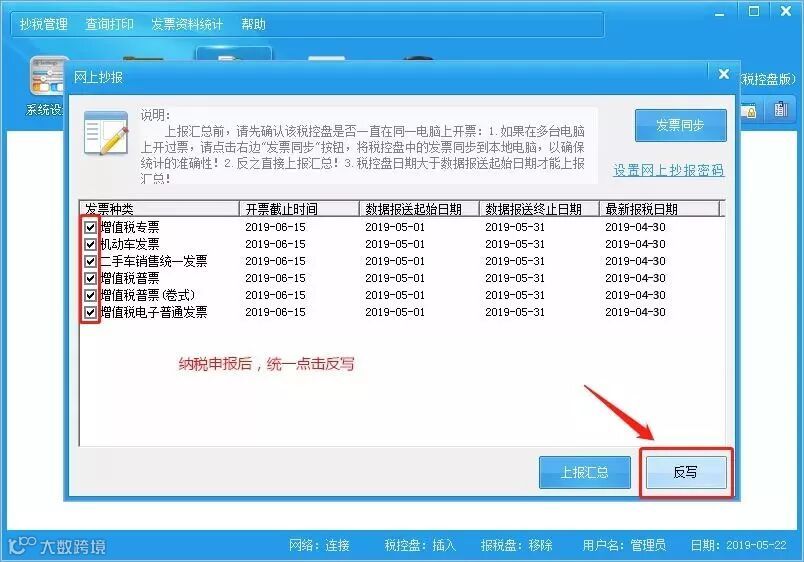 ③申报成功后,再次点击【报税处理】-【网上抄报】,勾选全部发票种类点击【反写】,提示反写监控成功。