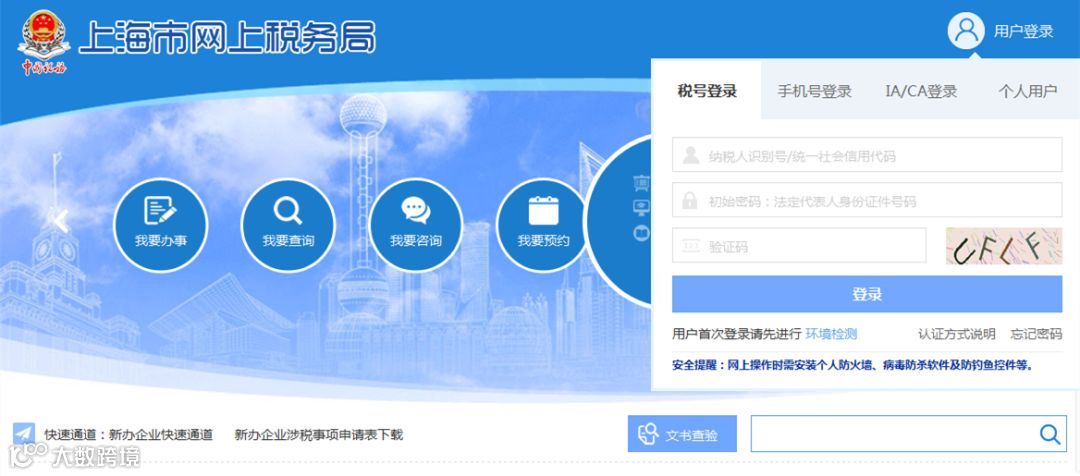 2.点击“用户登陆”,可通过税号登录、手机号登录、IA/CA登录等任一登录方式,登陆网上税务局。