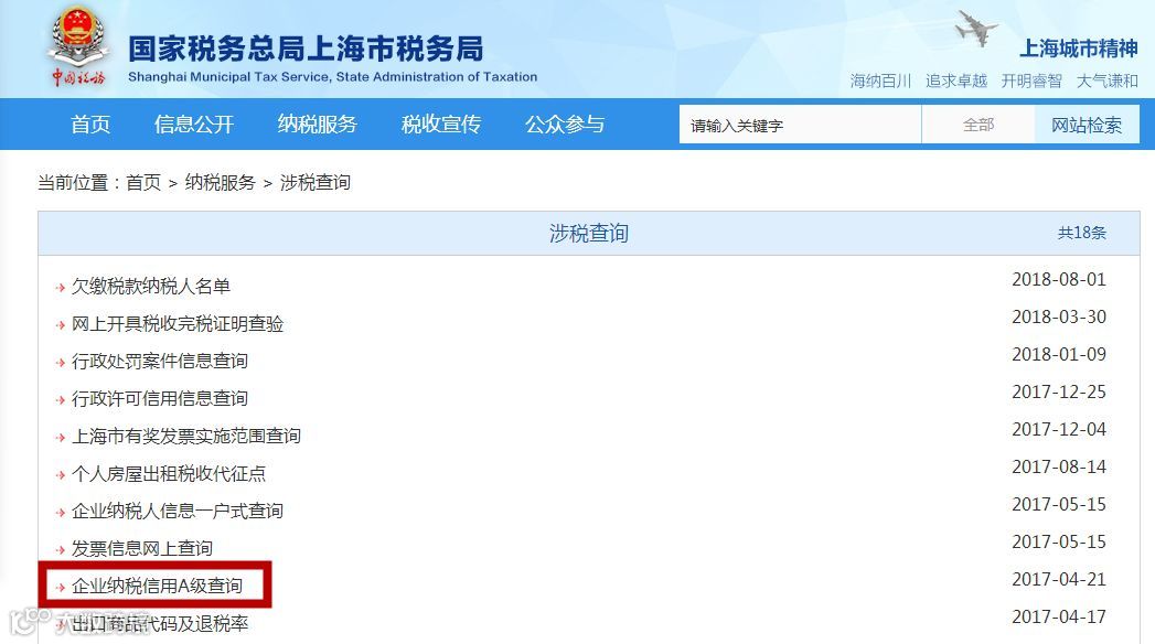 1.打开“国家税务总局上海市税务局”网站(www.tax.sh.gov.cn),点击首页中的“我要查询”,然后点击“企业纳税信用A级查询”。