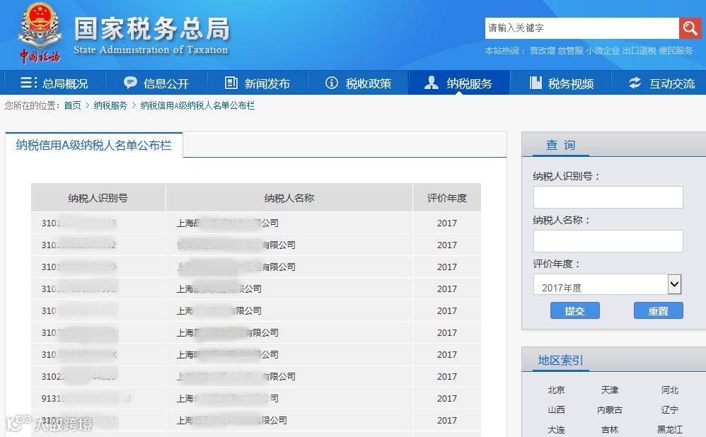 3.清空查询条件,选择相应地区,即可查看到当地所有A级纳税人名单。