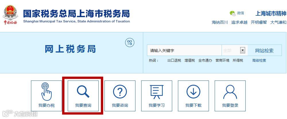 1.打开“国家税务总局上海市税务局”网站(www.tax.sh.gov.cn),点击首页中的“我要查询”。