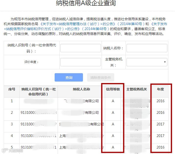 2.可根据企业信息查询纳税信用等级,也可以清空查询条件,直接点击“查询”,即可查看本市所有的A类企业名单。