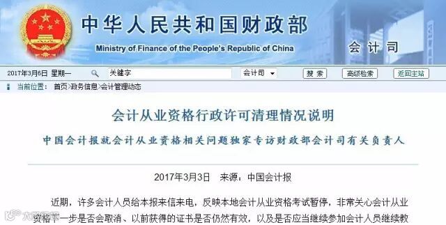 自从3月3号财政部发布了“会计证取消”的公文后,这半个多月被“会计证”一轮又一轮的刷屏,为各大媒体贡献了足够的话题性,网上的各种消息也是层出不穷,“会计证取消”也是当仁不让地霸占了头条,连一向喜欢炒作的“娱乐圈”这段时间也变得风平浪静,不得不佩服“会计证”的威力。