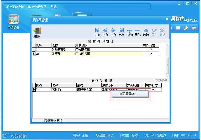 如果管理员密码忘记,可以将软件根目录下的system.dat文件剪切至桌面,重新初始化软件。正常进入操作界面之后,暂时不关闭软件,把之前剪切出来的system.dat文件重新备份回去。然后在软件中打开操作员管理,然后右击管理员,选择密码重置,即恢复为密码为空。最后重新打开软件登录。具体操作如下图:注:如果删除system.dat文件,软件中客户编码和商品编码会丢失,请谨慎操作。