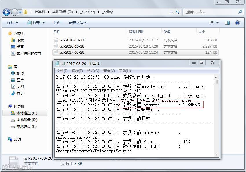 如果税务数字证书密码忘记,在正确进入过软件的电脑上可以进行查询,具体流程为:我的电脑/计算机-C盘-_skpclog文件夹-_ssllog文件夹-ssl年月日txt文件,打开后找到“参数设置Password:XXXXXX”,XXXXXX即为税务数字证书密码,如下图:
