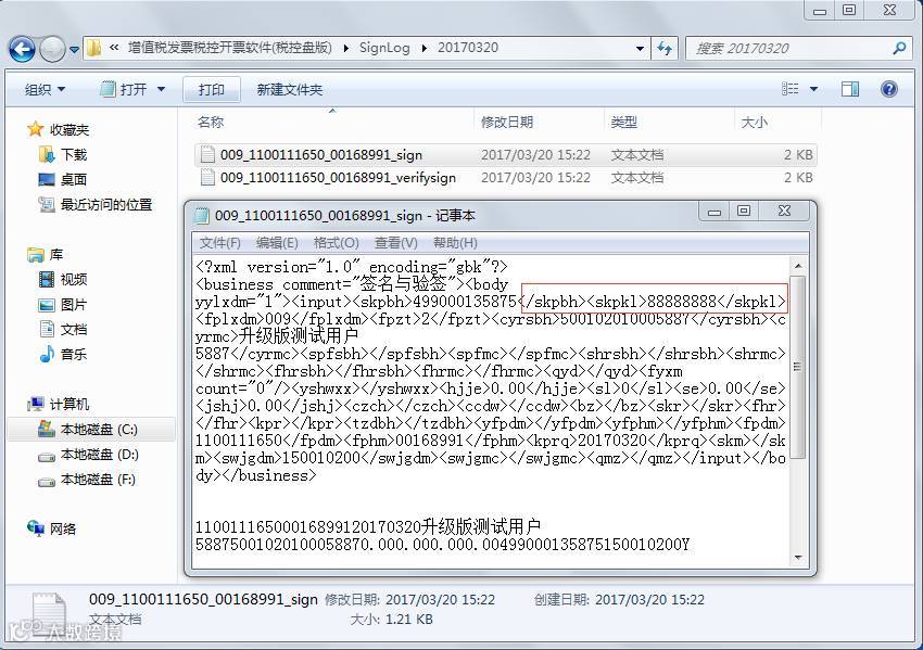 如果忘记密码,在本台电脑上进入过软件的情况下,可以找回密码,具体流程为:右击开票软件图标-属性-查找目标/打开文件位置-Signlog文件夹,找到正确进入过软件的日期txt文档,进入后找到<skpkl>XXXXXX<skpkl>字段,XXXXXX即为税控盘口令,如下图: