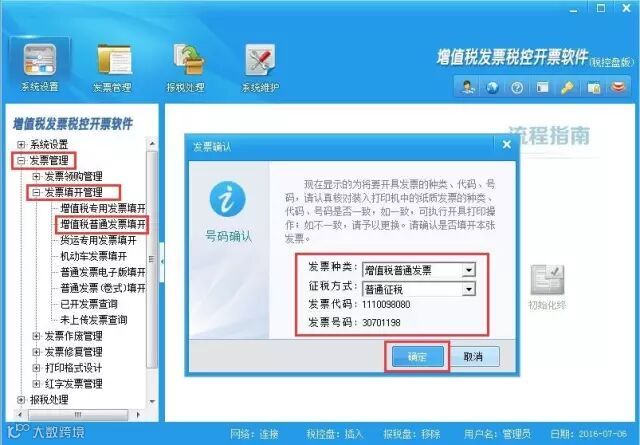 6. 退出商品编码后进入开票界面,点击“发票管理--发票填开管理--增值税普通发票填开”核对发票代码及号码与纸质发票保持一致,点击确定 如下图: