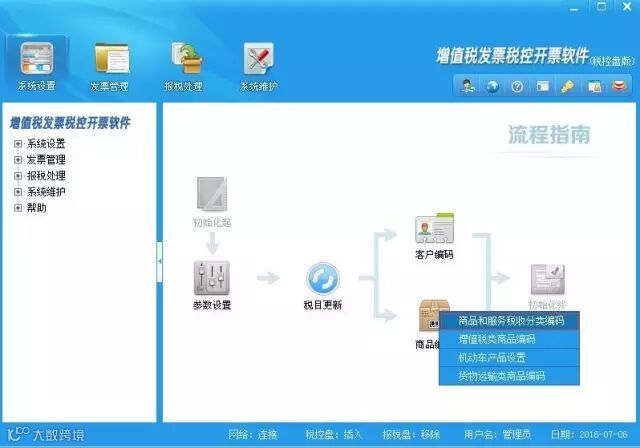 2. 选择开票员身份进入开票软件,点击“系统设置--基础编码设置--商品和服务税收分类编码”,如图所示: