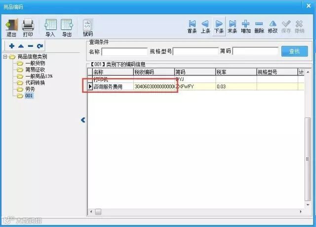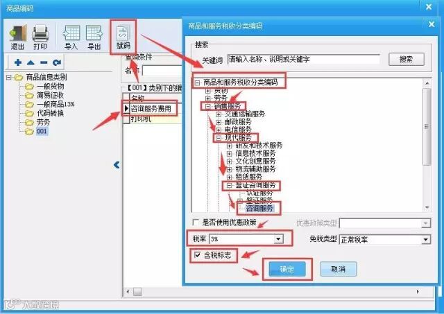 1. 例:对“增值税类商品编码中的咨询服务费用”为例,点击“系统设置-基础编码设置-增值税类商品编码”,鼠标选中“咨询服务费用”点击“赋码”,选择税收分类编码大类下的子类“咨询服务”,选择“税率”、“含税标志”,点击确定即可。如图所示: