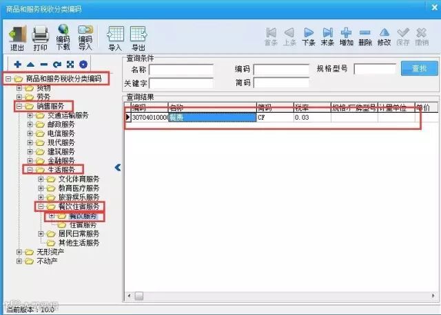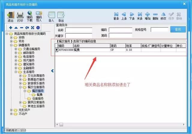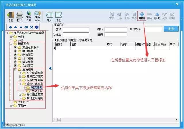 例:餐饮行业的用户需要添加“餐费”项目,需要选择商品大类及子类“销售服务--生活服务--餐饮住宿服务--餐饮服务”点击右上角“增加”如图所示: