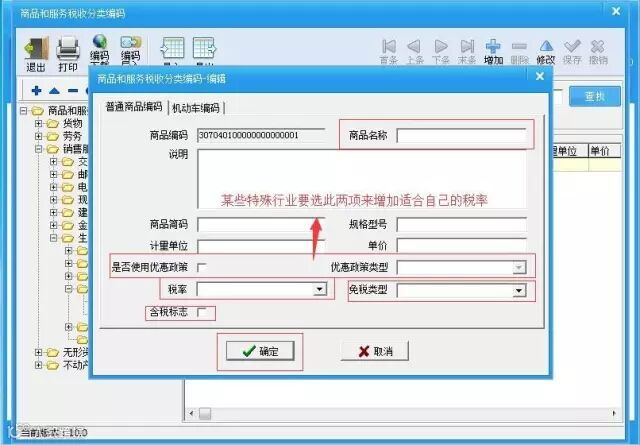 5. 进入增加页面,依次填写商品名称、选择商品税率、确认含税标志,点击确定,如图所示: