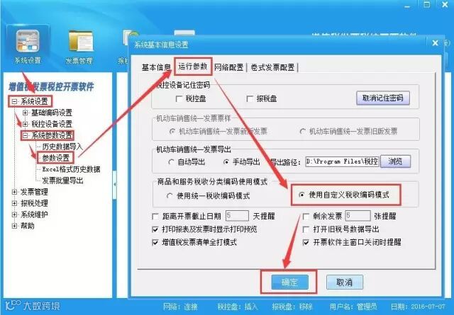 说明:开具发票时默认“使用统一税收编码模式”,若使用原基础编码设置中的商品编码,需在“系统设置”-“系统参数设置”-“参数设置”-“运行参数”中将商品和服务税收分类编码的使用模式选择为“使用自定义税收编码模式” 如图所示: