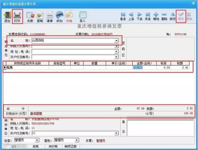 8. 将相关信息填写完毕后,点击打印,发票即开具成功