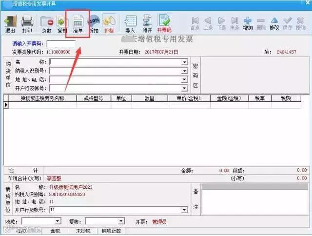 7、清单上会显示购货方、销货方名称,发票版本代码和发票号码,与发票版面上相对应;