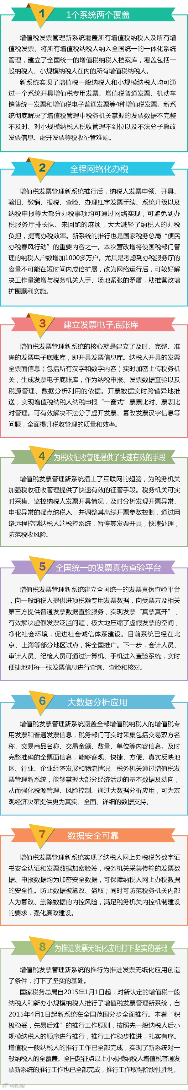 为适应税收现代化建设需要,满足增值税一体化管理要求,切实减轻基层税务机关和纳税人负担,国家税务总局决定自2015年起,在全国范围分步全面推行增值税发票管理新系统。目前新系统已开发完成的功能及创新主要有以下8个亮点。
